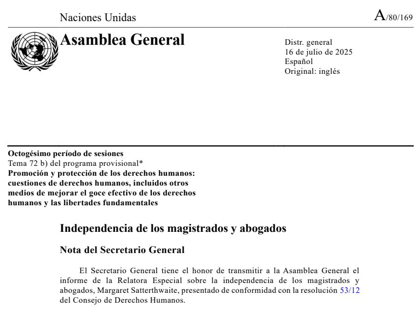 Perfecto. A continuación redactaré la sinopsis académica completa (≈2.400 palabras) del informe La inteligencia artificial en los sistemas judiciales: promesas y escollos (A/80/169), presentada por la Relatora Especial Margaret Satterthwaite ante la Asamblea General de las Naciones Unidas (2025).